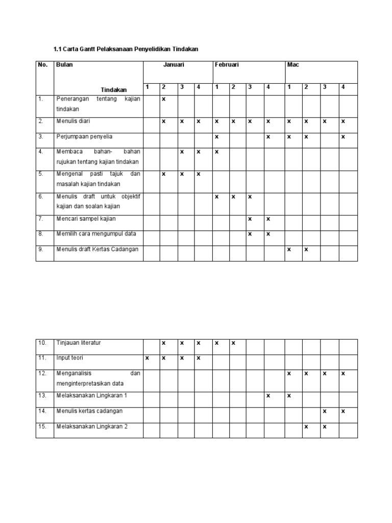 Jadual pelaksanaan pelan kajian tindakan (carta gantt) minggu.